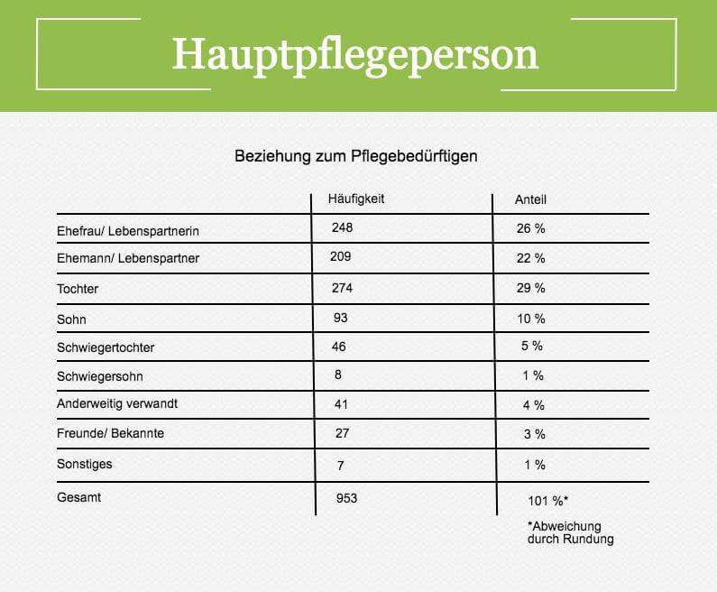 Rund 70 Prozent der Pflegebedürftigen werden im eigenen Zuhause versorgt. Meist übernimmt eine Hauptpflegeperson den Löwenanteil der Betreuung und Versorgung. Zu 48 Prozent handelt es sich dabei um den Lebenspartner, dicht gefolgt von den Kindern (39 Prozent). In beiden Fällen ist der weibliche Anteil größer – nur ein Drittel aller Hauptpflegepersonen ist männlich.